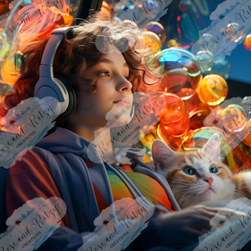 “Daydreaming by Sarah Brice is a captivating piece of personal art featuring a girl lost in her thoughts, accompanied by a cat and surrounded by whimsical bubbles. Perfect for daydreamers.”