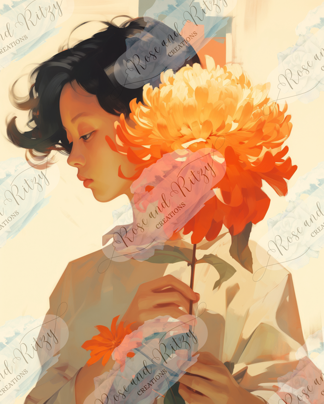 Delicate by Hannah Lipskey is a stunning portrait of a woman holding a vibrant orange flower, exuding grace and elegance. Perfect for personal art collections.
