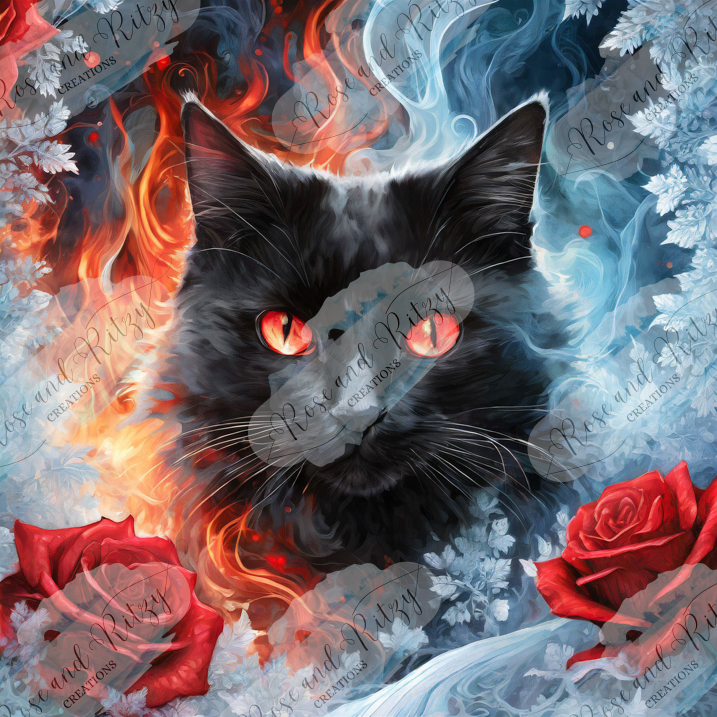 Duality of Shadows by E Lennie is a captivating digital artwork that combines elements of darkness and beauty, featuring a mysterious black cat surrounded by fiery and floral motifs.