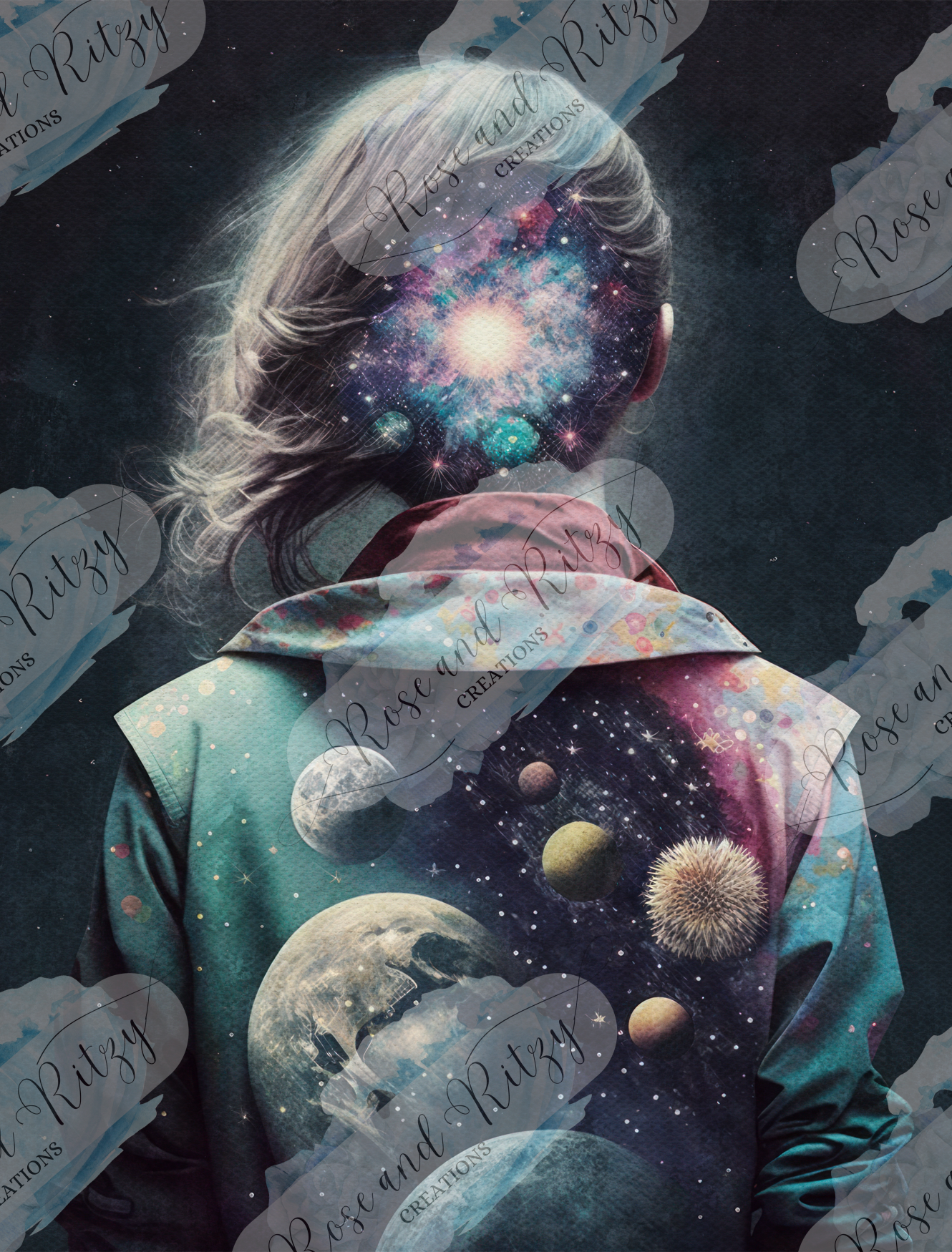 Introducing “Infinite” by Hannah Lipskey, a stunning piece of personal art that captures the beauty and mystery of the universe. Featuring a woman adorned in a jacket adorned with images of space, this unique artwork is sure to spark curiosity and wonder in any space. Explore the infinite possibilities with “Infinite” today.