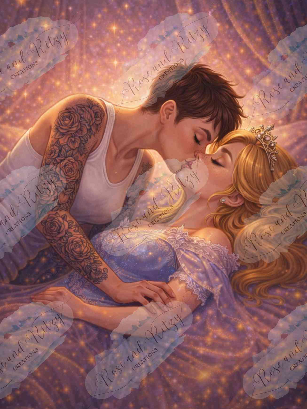 A tender, modern retelling of a timeless fairy‑tale moment, this piece reframes the classic “true love’s kiss” through authenticity, strength, and self‑chosen identity. The soft glow, the crown, the tattoos, and the closeness between them create a story where rescue isn’t about a prince at all—it’s about love that arrives in its own form, on its own terms. As a diamond painting, it becomes a beautifully emotional project, each sparkling drill honoring the truth that real love doesn’t follow old rules; it simply shows up as it is.