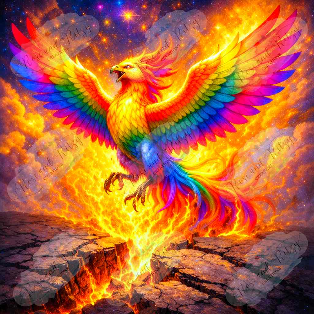 A blazing, triumphant vision of rebirth, this piece captures the moment a spirit rises from everything that tried to break it. The sweeping rainbow plumage, the molten light, and the cosmic sky turn the phoenix into a symbol of Pride, resilience, and unstoppable transformation. As a diamond painting, it becomes a powerful, energizing project—each sparkling drill adding to a story of rising higher, shining brighter, and reclaiming your place in the world with fire in your wings.